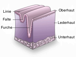 Wie in obiger Grafik dargestellt, differenziert man bei unserer Haut hinsichtlich der Tiefe einer Hautfalte zwischen einer sogenannten Linie (nur oberflächlich), einer Falte (entspricht einer mittleren Tiefe) und einer Furche (die sehr tief geht).